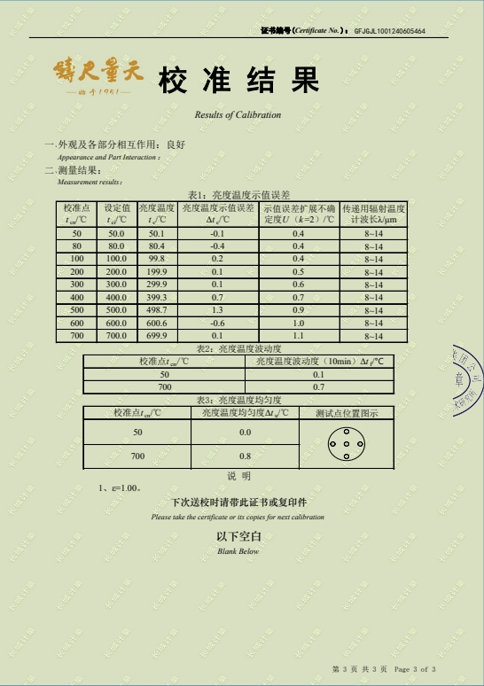 黑體輻射源(50-700℃)304所校準證書 2024-6-18 本文被閱讀 7518 次