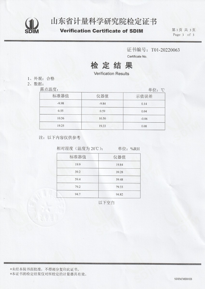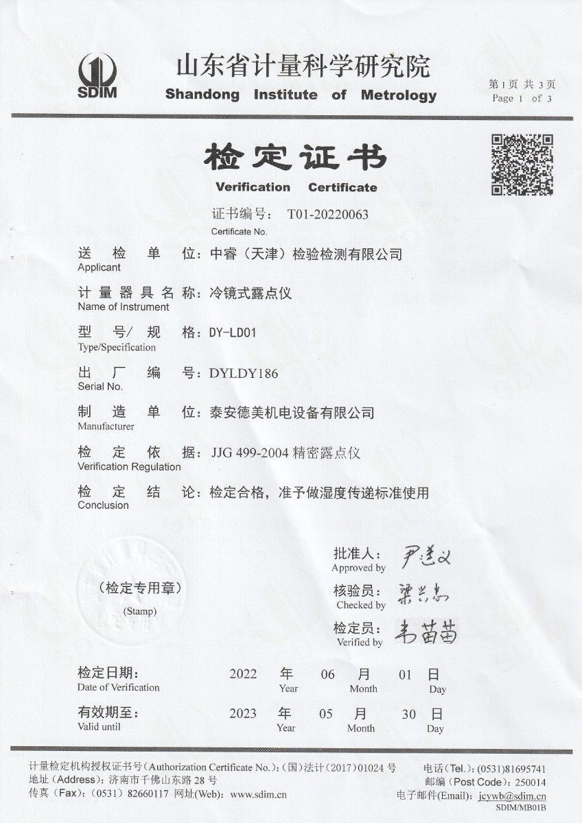 中睿(天津)檢驗檢測有限公司-冷鏡式露點儀檢定證書 2022-6-14 本文被閱讀 14441 次