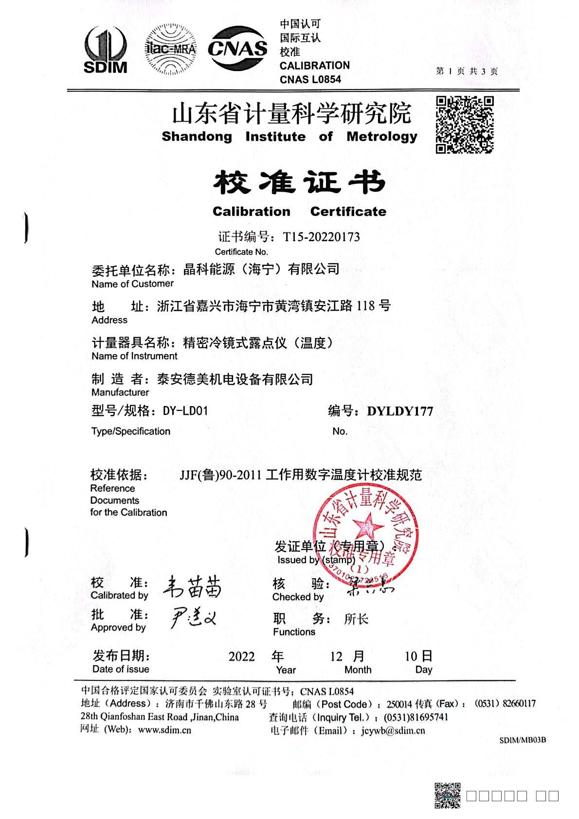 | 上一條:晶科能源(海寧)有限公司 精密冷鏡式露點儀 檢定證書 | 下一條:DY-HT2M-C高溫面源黑體爐(100mm) |