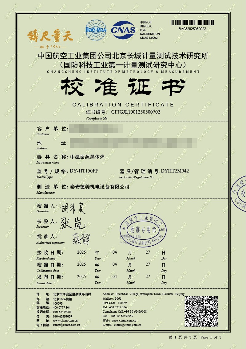 | 上一條:腔式黑體輻射源(-50-100℃)校準(zhǔn)證書(shū) | 下一條:DY-HT2M-C高溫面源黑體爐(100mm) |