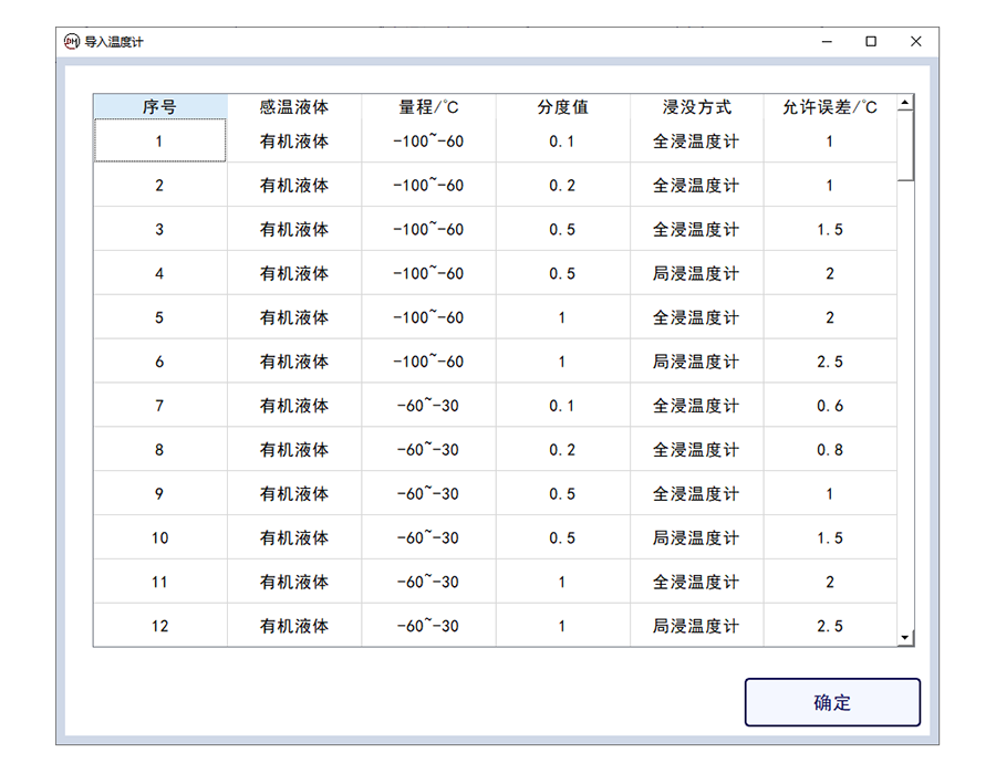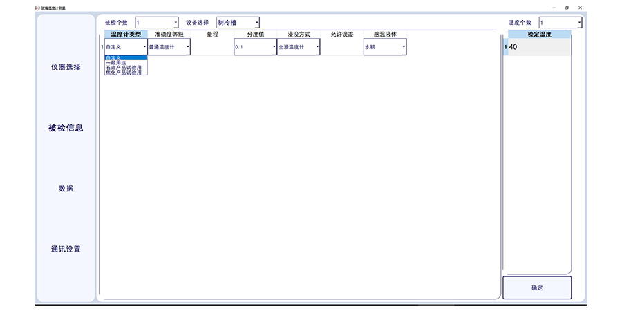 4.可進(jìn)行玻璃溫度計(jì)的類(lèi)型選擇,選擇分度值、浸沒(méi)類(lèi)型計(jì)允差,判斷溫度是否合格,