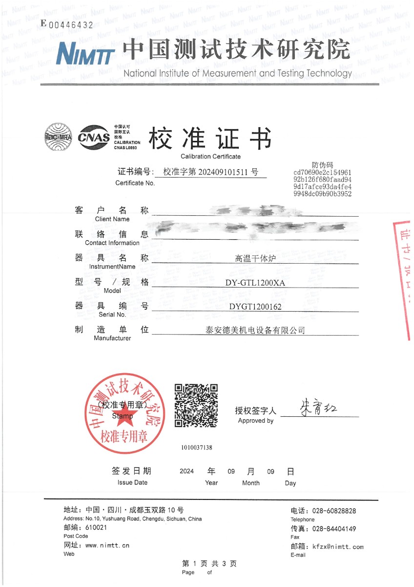 | 上一條:泰安德美-輻射溫度計(jì)(-30~900℃)校準(zhǔn)證書 | 下一條:DY-HT2M-C高溫面源黑體爐(100mm) |