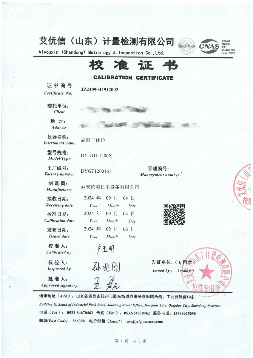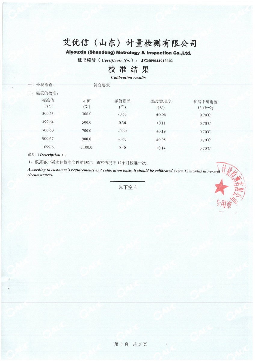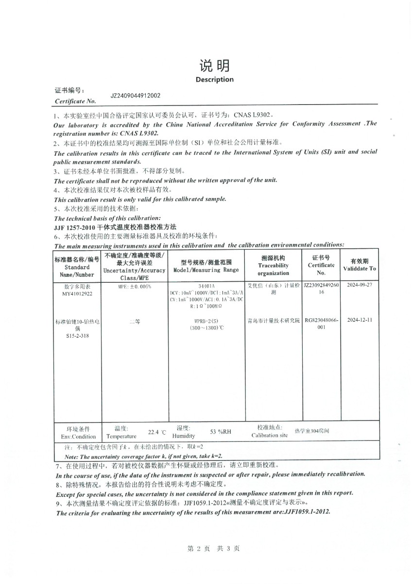 高溫干體(300~1200℃)校準證書 2024-9-18 本文被閱讀 7037 次