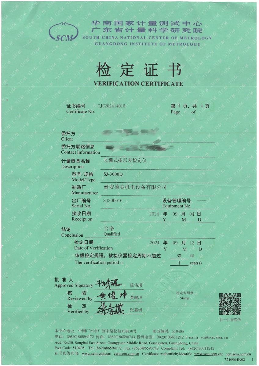 光柵式指示表檢定儀檢定證書 2024-9-20 本文被閱讀 7036 次