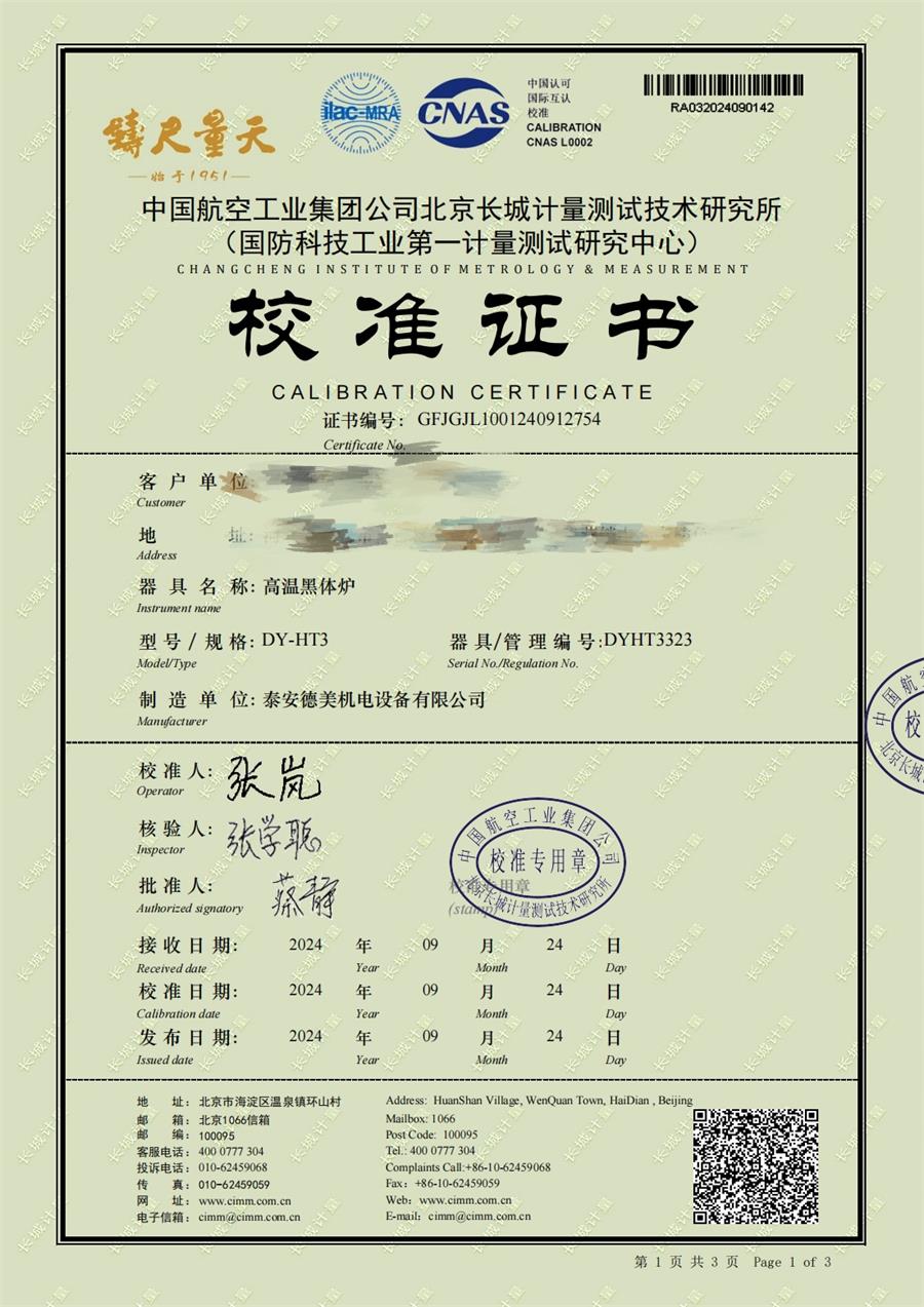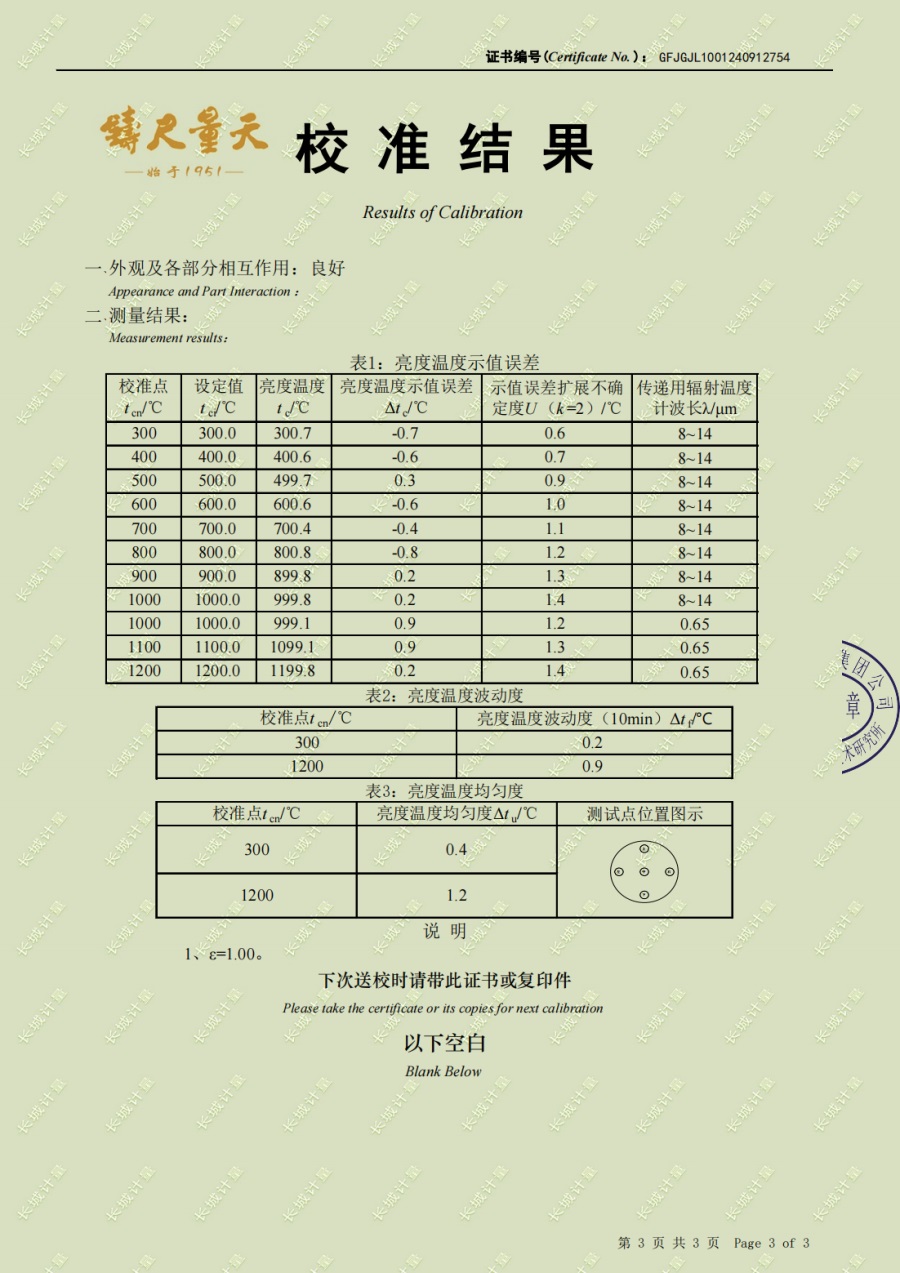 高溫黑體爐(300-1200℃)校準證書 2024-10-17 本文被閱讀 6182 次