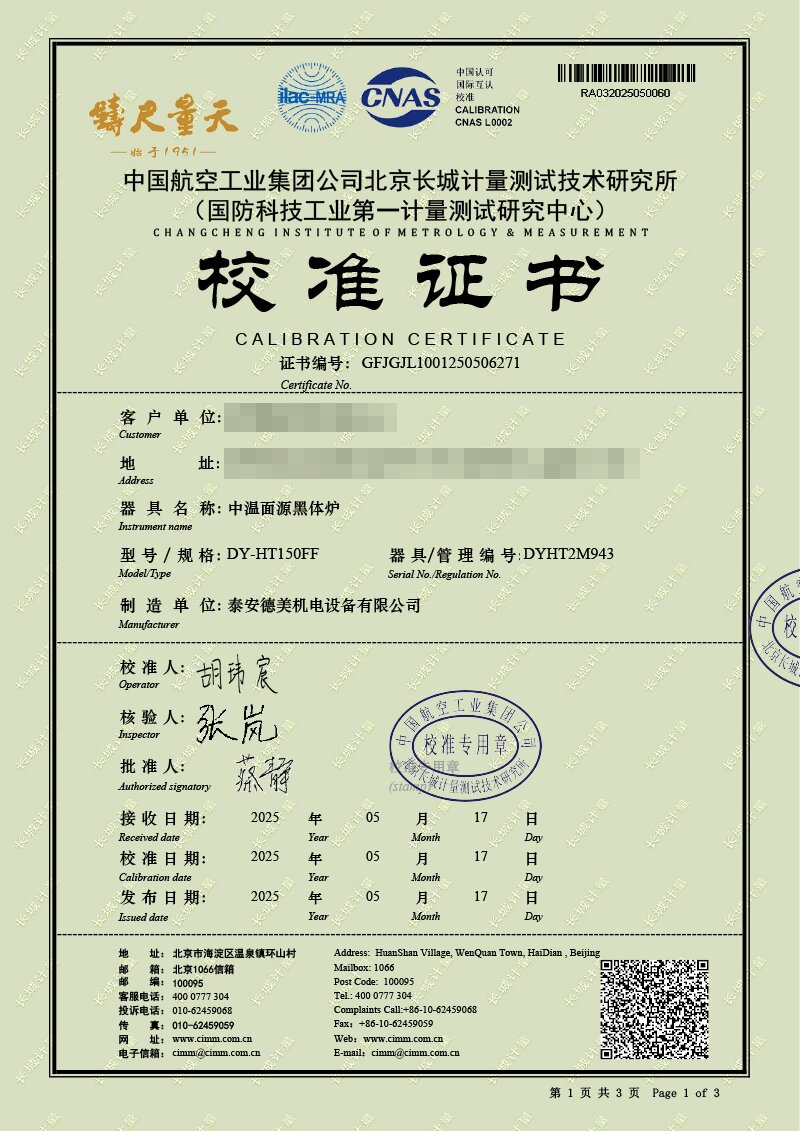 中溫面源黑體爐(室溫+5-500℃)校準證書 2025-5-21 本文被閱讀 4228 次