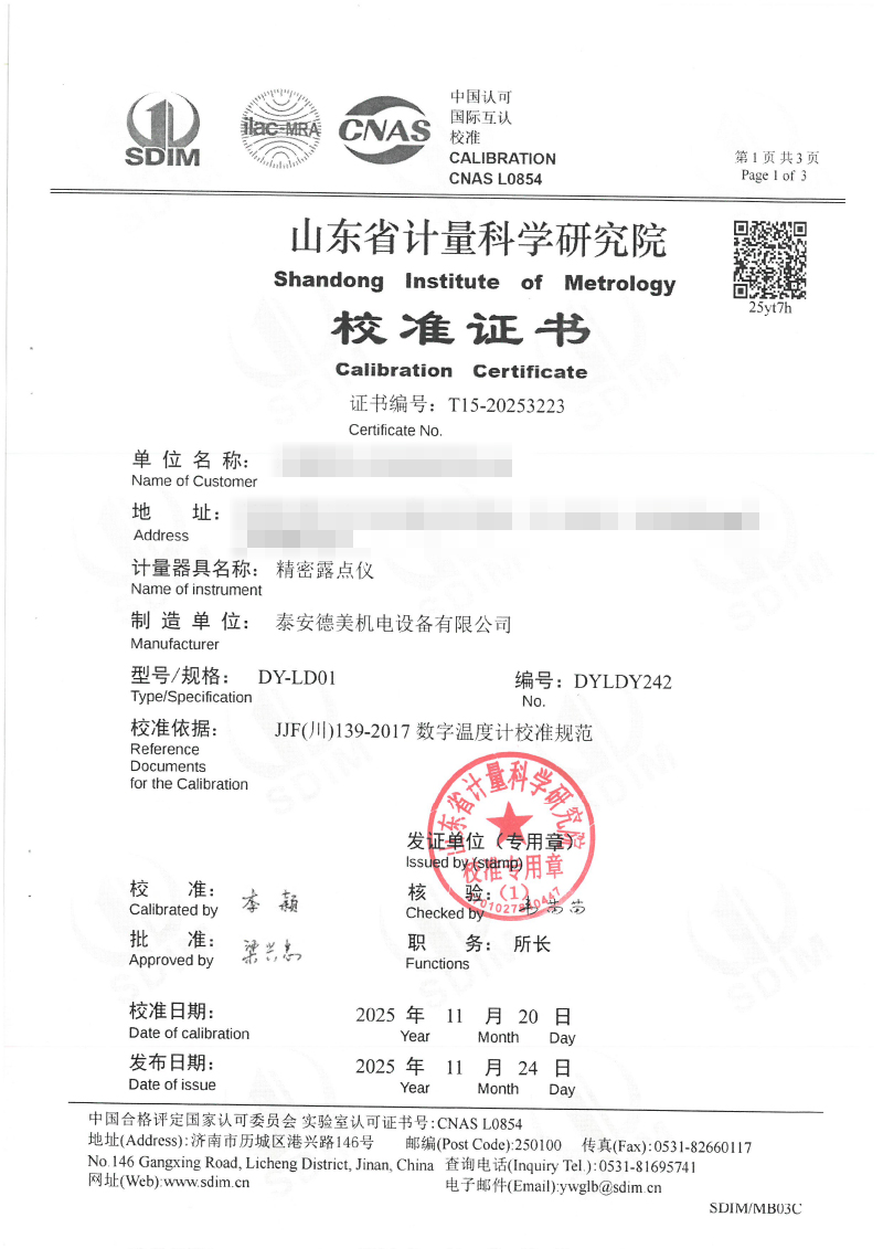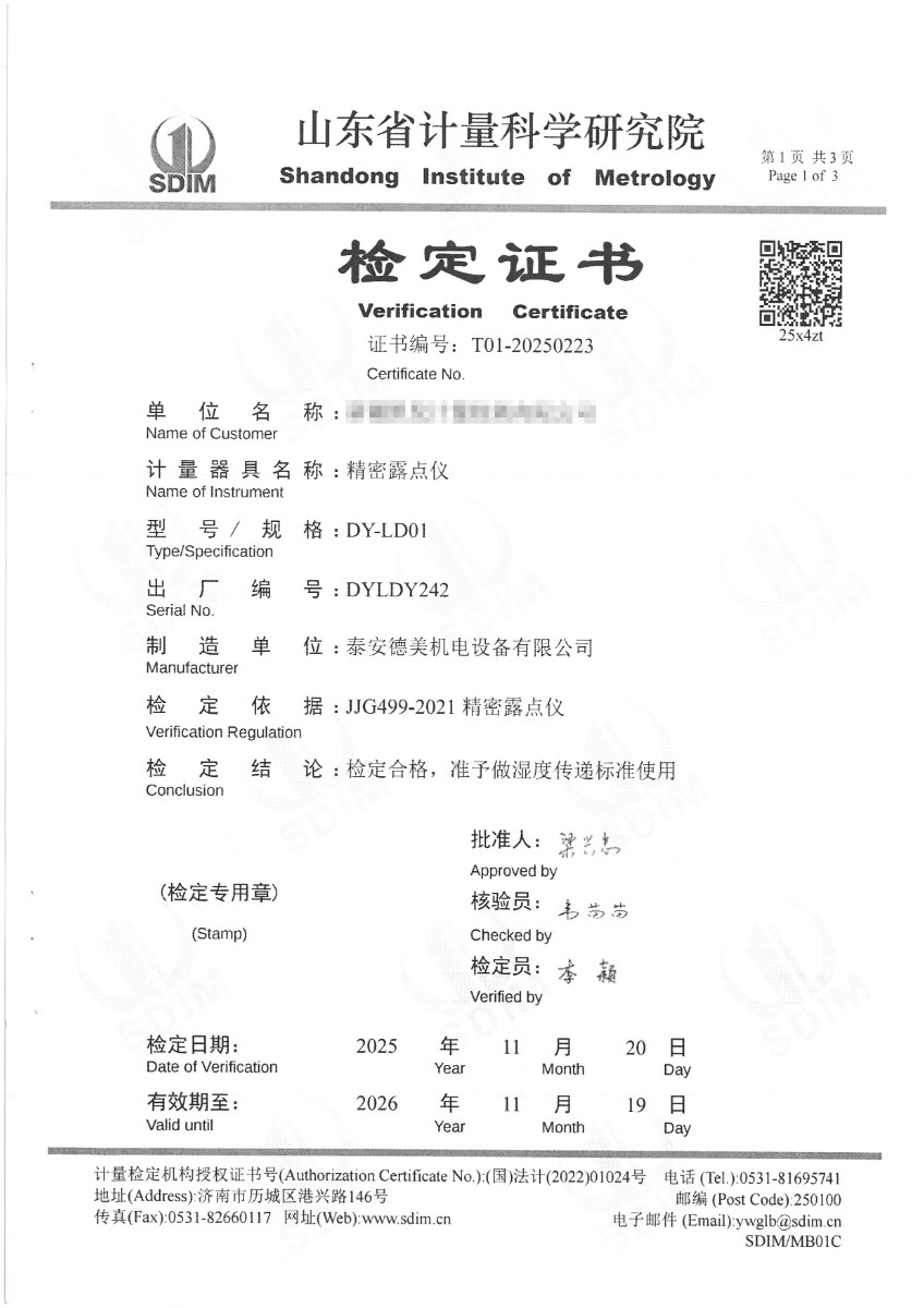 露點儀檢定、校準證書 2025-12-4 本文被閱讀 1680 次