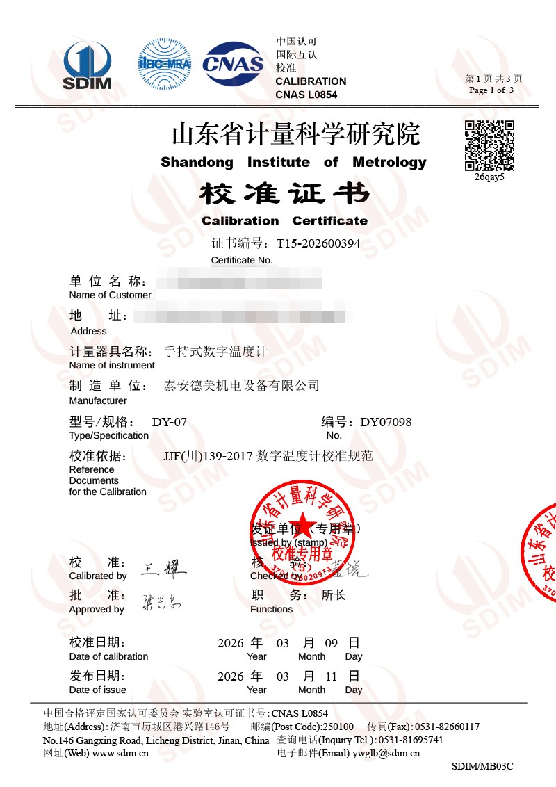 數(shù)字溫度計(jì)-校準(zhǔn)證書 2026-3-11 本文被閱讀 799 次