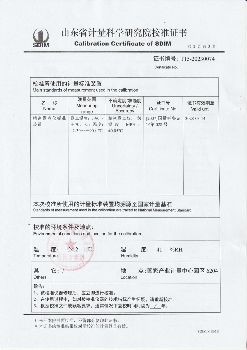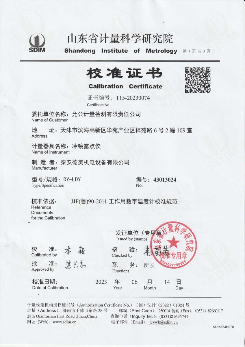 允公計(jì)量檢測(cè)有限責(zé)任公司-冷鏡露點(diǎn)儀校準(zhǔn)證書 2023-6-25 本文被閱讀 14319 次