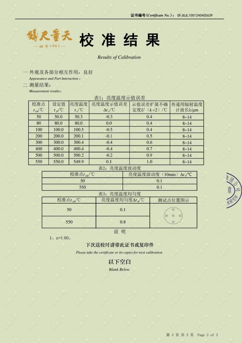 黑體爐校準(zhǔn)證書 2024-4-24 本文被閱讀 9927 次