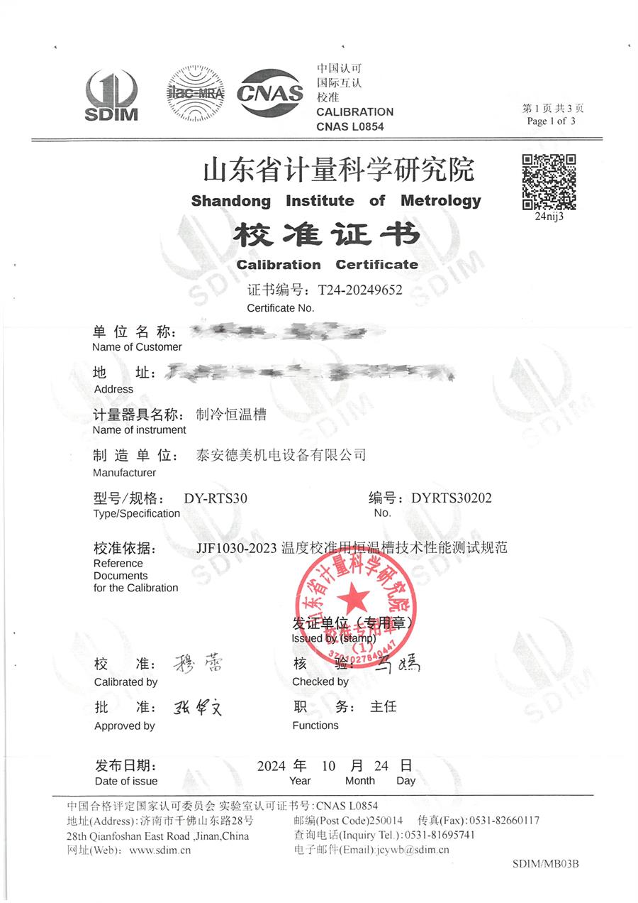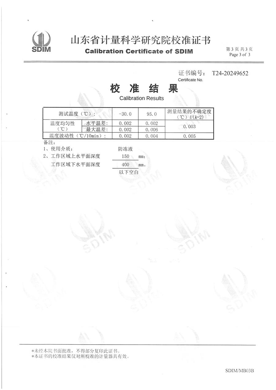 制冷恒溫槽(-30-95℃)校準證書 2024-11-2 本文被閱讀 7799 次
