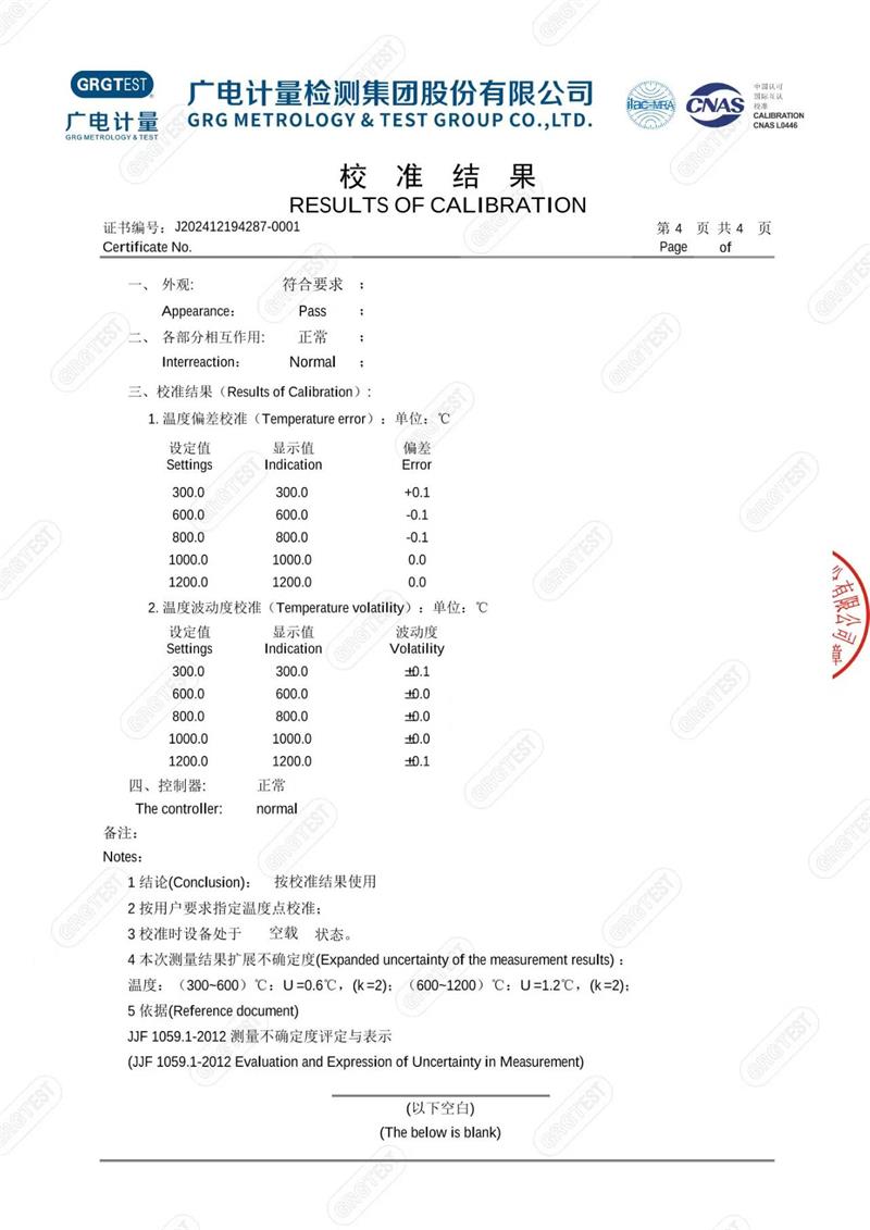高溫干體爐(300-1200℃)校準(zhǔn)證書
