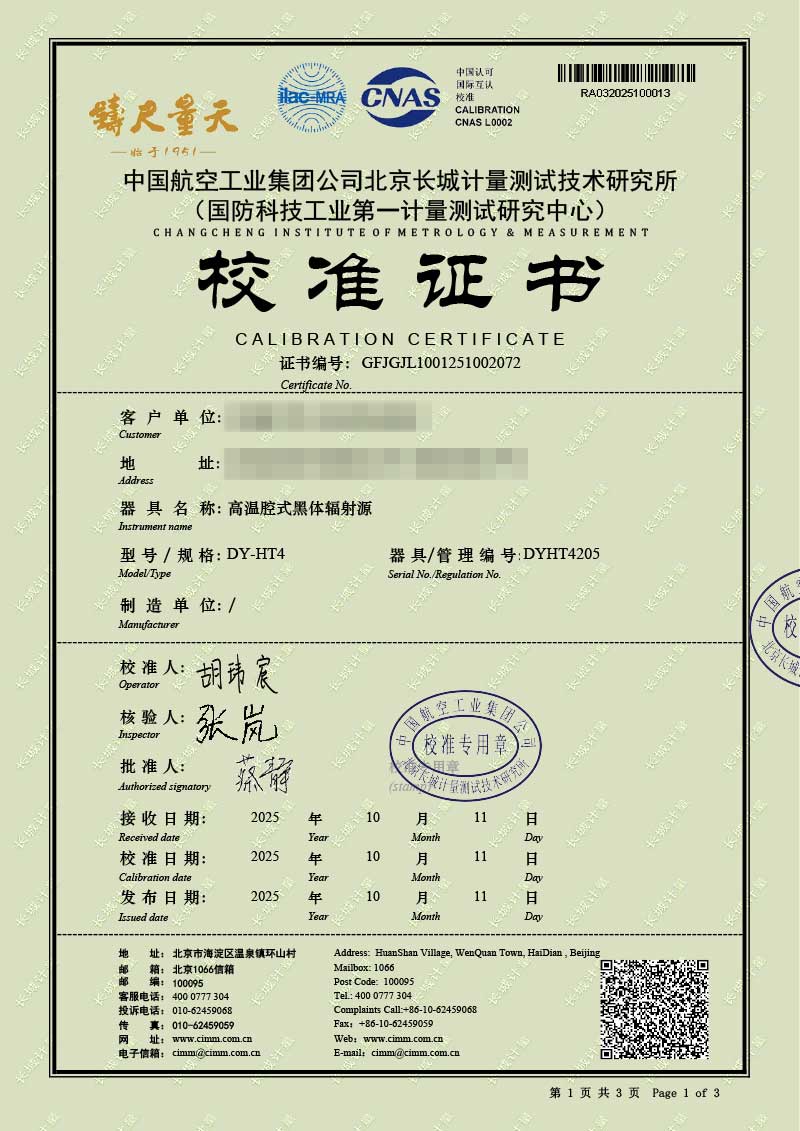 高溫腔式黑體輻射源(700-1600℃)校準證書