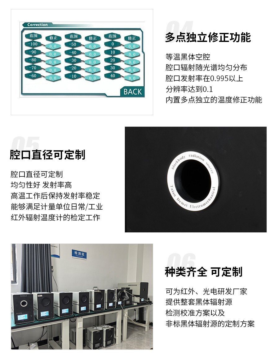 標(biāo)準(zhǔn)黑體作為標(biāo)準(zhǔn)輻射源,主要用于校準(zhǔn)輻射溫度計、紅外溫度計和輻射溫度傳感探測器。我公司目前具有先進(jìn)的黑體技術(shù),產(chǎn)品種類全、溫度范圍寬的黑體系列產(chǎn)品。產(chǎn)品體積小、重量輕、便于攜帶,不僅適合各級計量機(jī)構(gòu)實驗室校準(zhǔn)輻射溫度計使用,同時可以用于現(xiàn)場校準(zhǔn)。