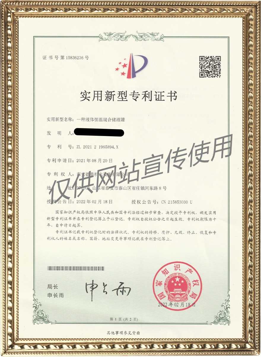 一種液體恒溫混合儲(chǔ)液罐——實(shí)用新型專(zhuān)利證書(shū)