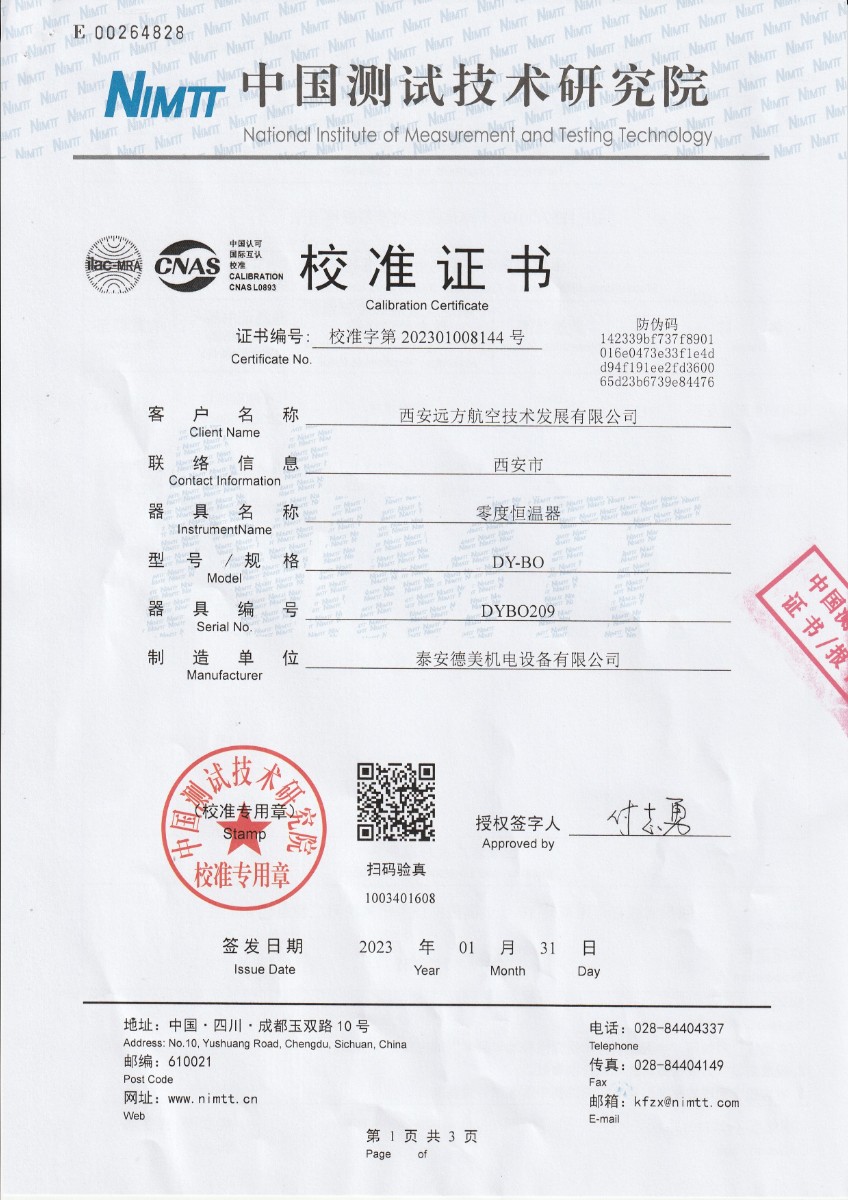 西安遠(yuǎn)方航空技術(shù)發(fā)展有限公司 零度恒溫器 校準(zhǔn)證書 2023-4-10 本文被閱讀 15502 次