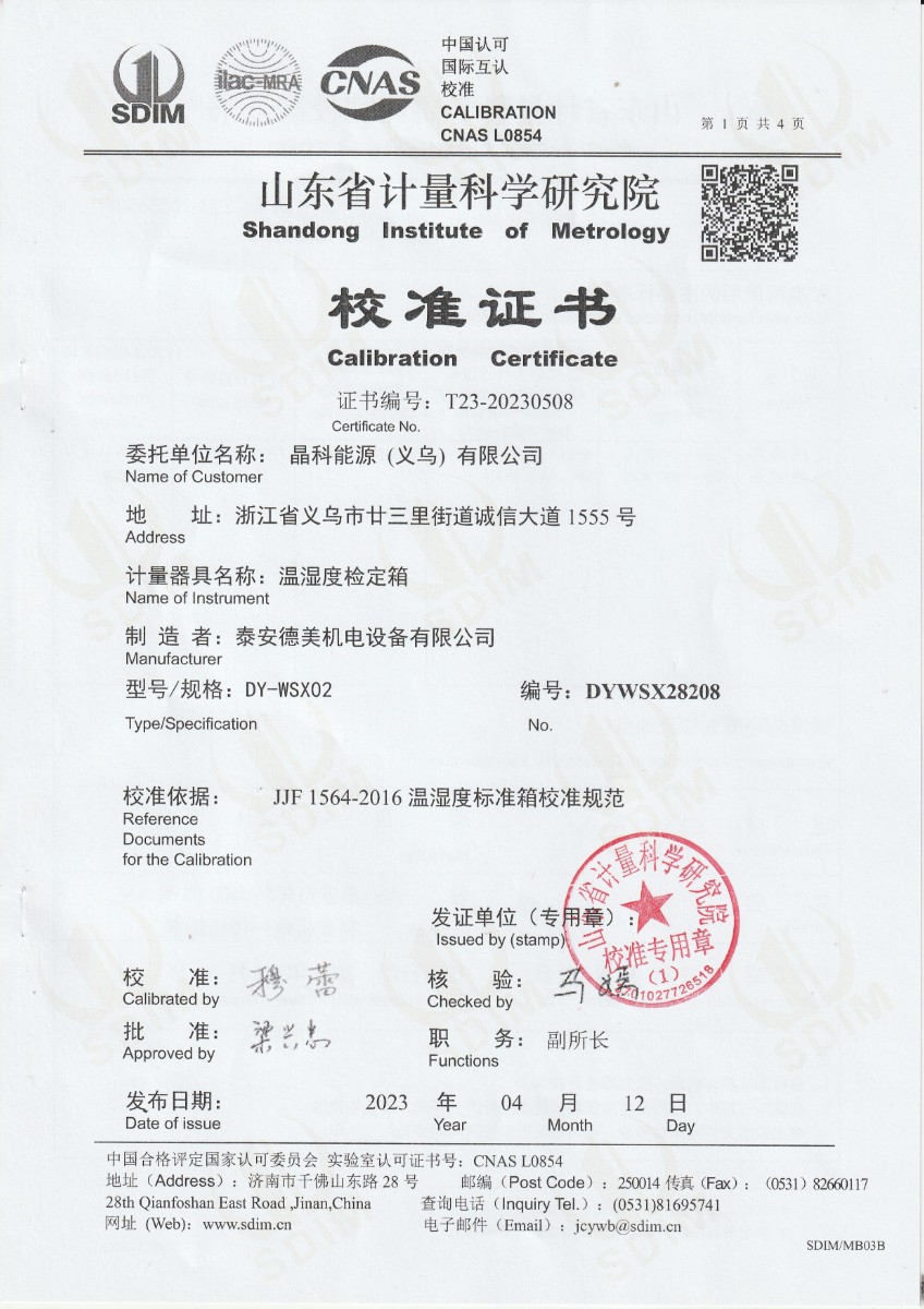 晶科能源(義烏)有限公司 溫濕度檢定箱 校準(zhǔn)證書 2023-5-4 本文被閱讀 14732 次