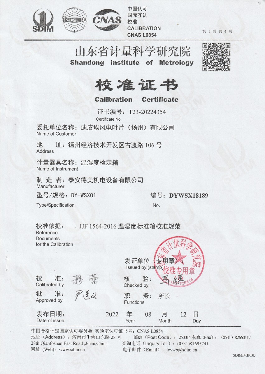 迪皮埃風電葉片(揚州)有限公司-溫濕度檢定箱 2022-8-22 本文被閱讀 14825 次