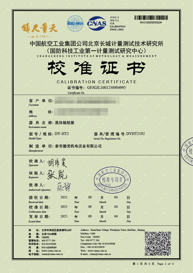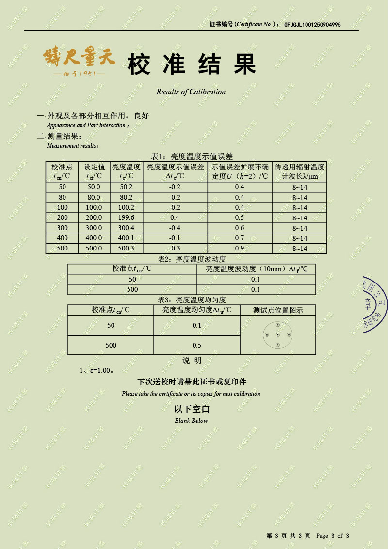 黑體輻射源(50-500℃)校準證書 2025-9-12 本文被閱讀 2425 次