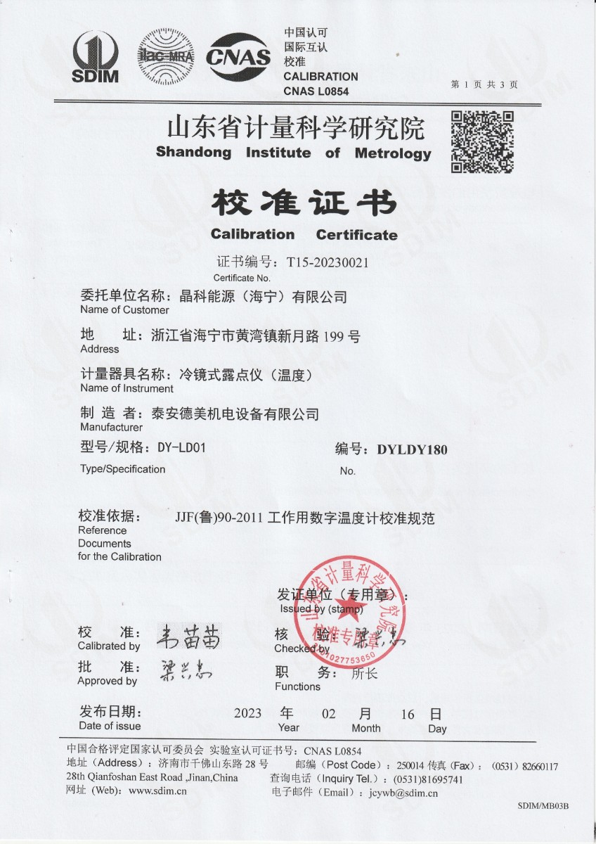 | 上一條:晶科能源(海寧)有限公司 冷鏡式露點(diǎn)儀 檢定證書 | 下一條:DY-HT2M-C高溫面源黑體爐(100mm) |